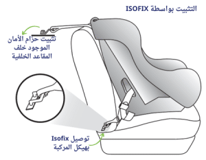 - ربط خطافات القفل (LATCH / Isofix) بنقاط التثبيت في المركبة، أو استخدام أحزمة المركبة لتثبيت مقعد الأمان في مكانه.